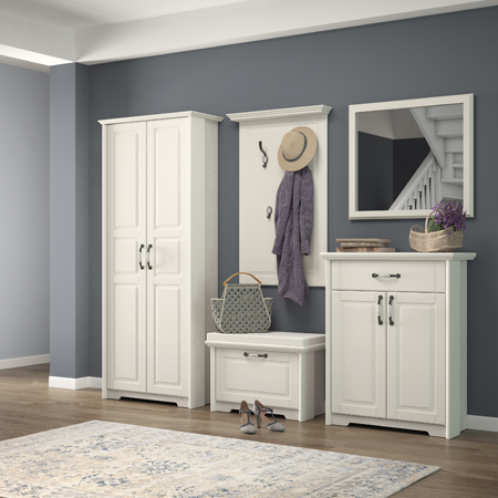 Predsoblje Stela sa frontovima lakiranim UV lakom bele boje u visokom sjaju i korpusom u dekoru Tobacco hrasta